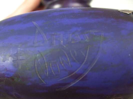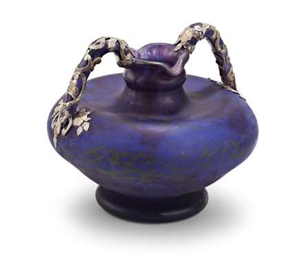 the handles with etched silver floral and foliate overlay, the blue glass body with mottled inclusions, etched mark 'Daum Nancy' with Cross of Lorraine
