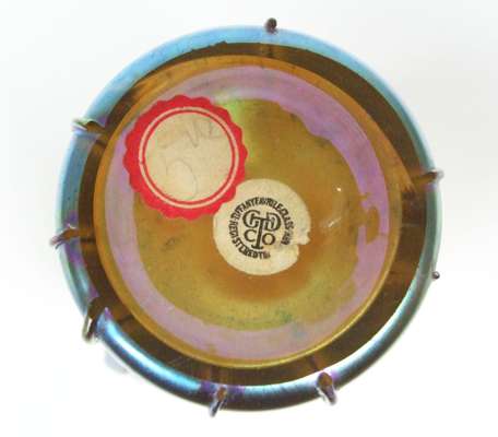 of baluster form with applied pulled prunts, covered in a peacock iridescence, bears maker's label, engraved mark '72173/ L.C.T.'