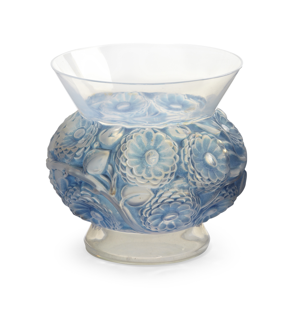 no. 1039, moulded with a band of flowers, original blue staining, script mark 'R. Lalique, France'