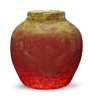 the ovoid red glass body with mottled yellow inclusions to the rim, bears original paper label