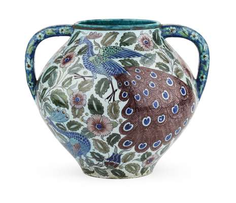 of ovoid form, decorated in a 'Persian' style with peacocks on a floral and foliate ground, impressed Merton Abbey maker's mark, bears painted initials 'F.P'