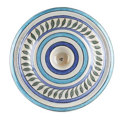 of circular moulded form with central domed boss decorated in a 'Persian' style with a griffin, enclosed by bands of entwined flowers, griffins and serpents, the reverse with concentric and leafy bands, bears painted initials 'C.P.', small rim chip