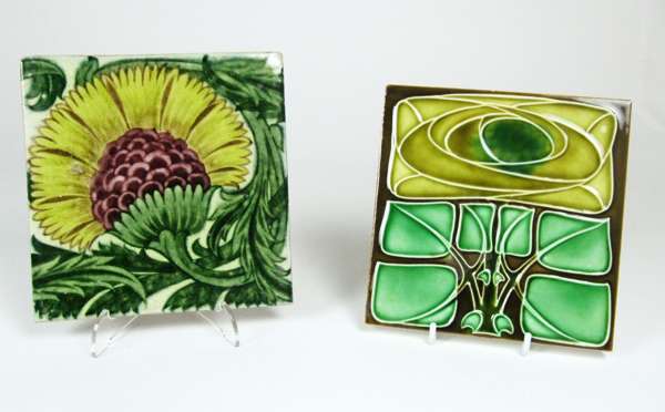 decorated with Iznik flowerhead, impressed Sands End mark, 15.5cm square; also an ART NOUVEAU TILE, decorated in tube line with a stylised floral motif, 15cm square (2)