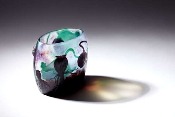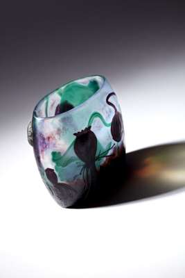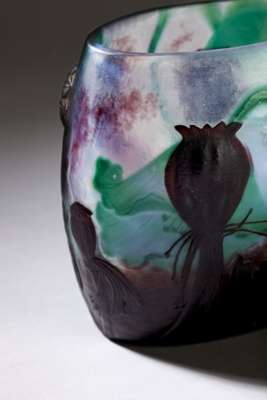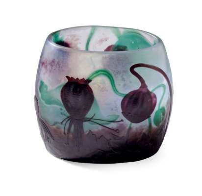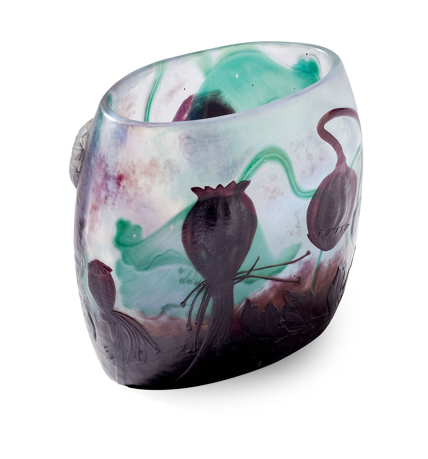 the opalescent body of oval section overlaid and applied in green and amethyst glass, wheel carved with poppy flowers and seed heads on a martelé ground, etched mark under base 'Daum/ Nancy' with Cross of Lorraine symbol, applied paper label '43'