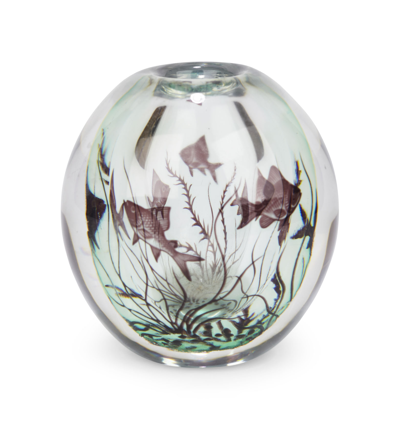 cased glass internally decorated with green fish, incised mark 'Orrefors Sweden/ Graal/ no 7349/ Edward Hald'
