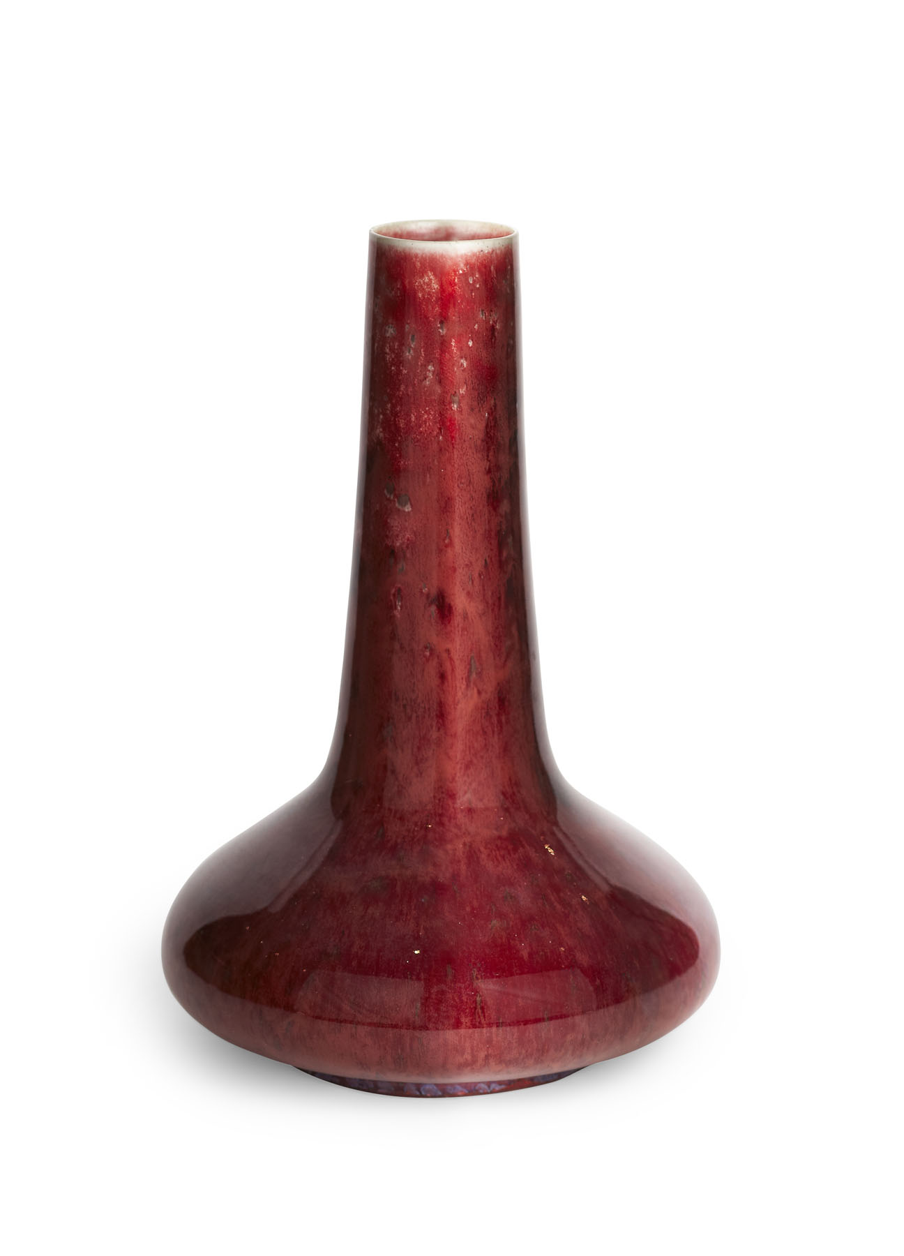 of flattened onion form, the cream body heavily covered in mottled sang de boeuf with oxidised spotting, graduating to magenta at the footrim, impressed factory marks 'Ruskin/ England/ 1925'