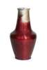 of shouldered ovoid form rising to a tall collar, the cream base glaze graduating to a streaking sang de boeuf, ending in a rich magenta, with black and green oxide spotting, impressed factory marks 'Ruskin/ England'