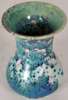 of flattened onion and shaft form with flared neck, with blue, green and violet glaze, impressed with factory mark and date 'Ruskin Pottery/West Smethwick/1903'