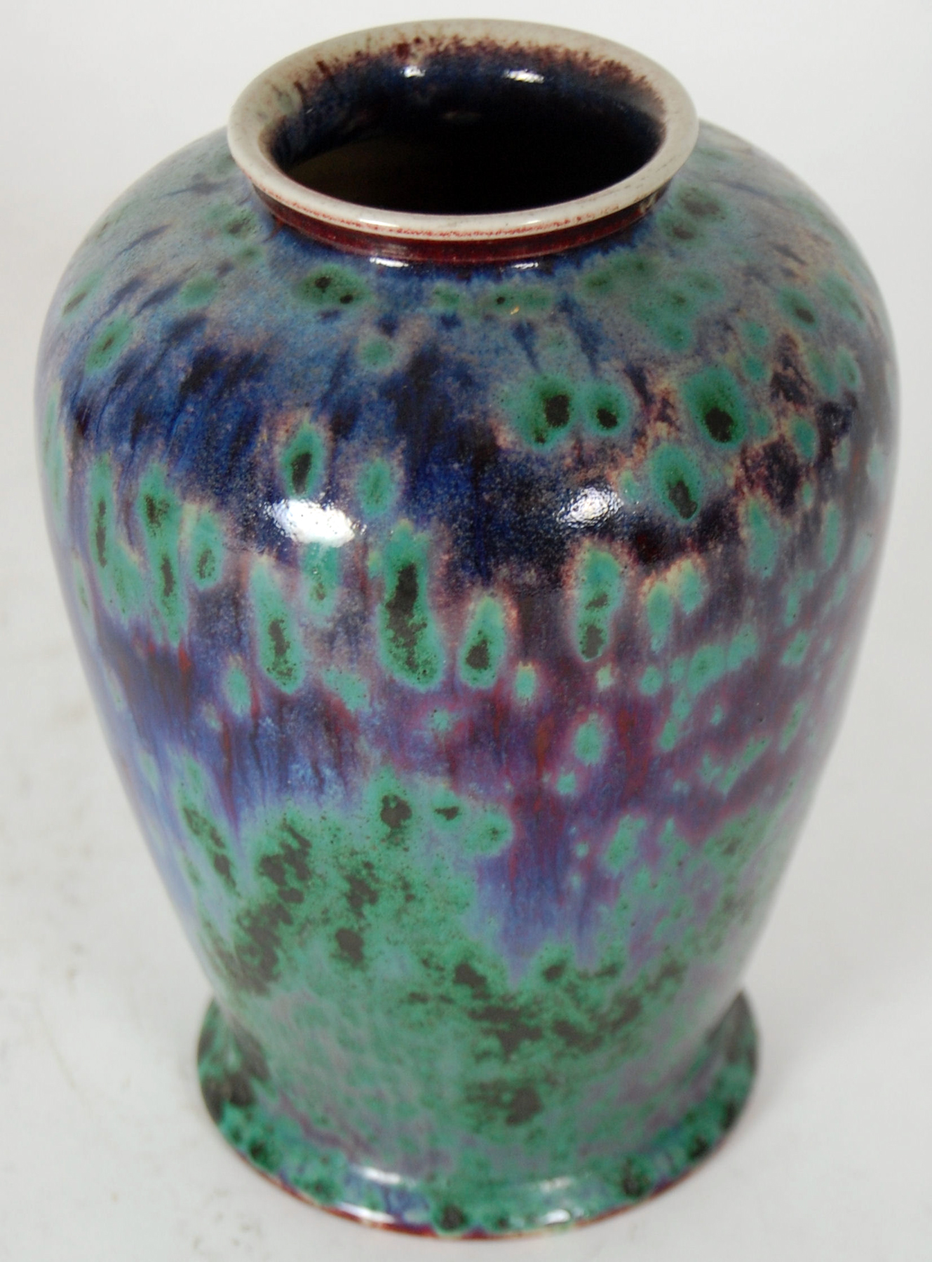 of footed shouldered ovoid form, with sang de boeuf and violet colours over a cream background, with oxidised green spotting overlay, impressed with factory mark, 'Ruskin Pottery/ West Smethwick/1905/No 108'