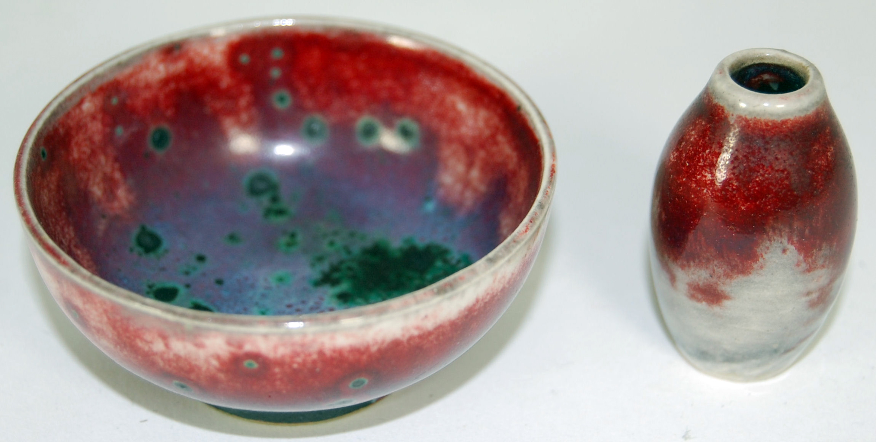 with sang de boeuf and violet glaze over a cream background and oxidised moss green spotting, impressed with factory mark and date, 'Ruskin/England/1933', 6cm; also a RUSKIN MINIATURE HIGH FIRED VASE, with sang de boeuf and grey glaze, impressed with factory mark 'Ruskin', 3.8cm (2)