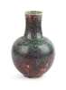 of bottle form, the cream body covered in mottled sang de boeuf and magenta glazes with black and green oxide spotting, impressed factory marks 'Ruskin/ England/ 1933'