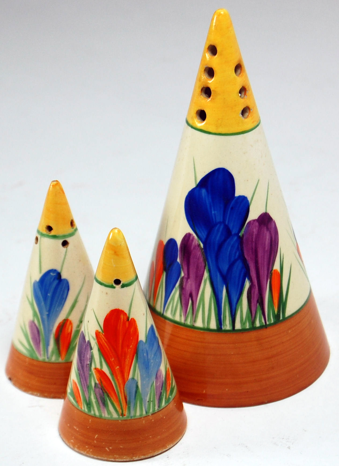 THREE 'CROCUS' CONICAL CONDIMENTS, 1930S