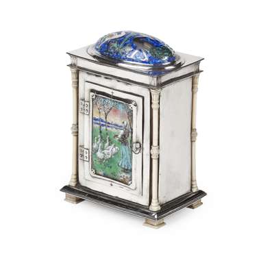 decorated in the Moorish style, the square dial with turquoise enamel hands and spandrels within a rectangular case, the rear door with enamelled panel depicting a goosegirl and geese in a landscape, the angles embellished by turned ivory columns, the whole with dome surmount enamelled with opposed peacock design and raised on ivory bracket feet, apparently unmarked