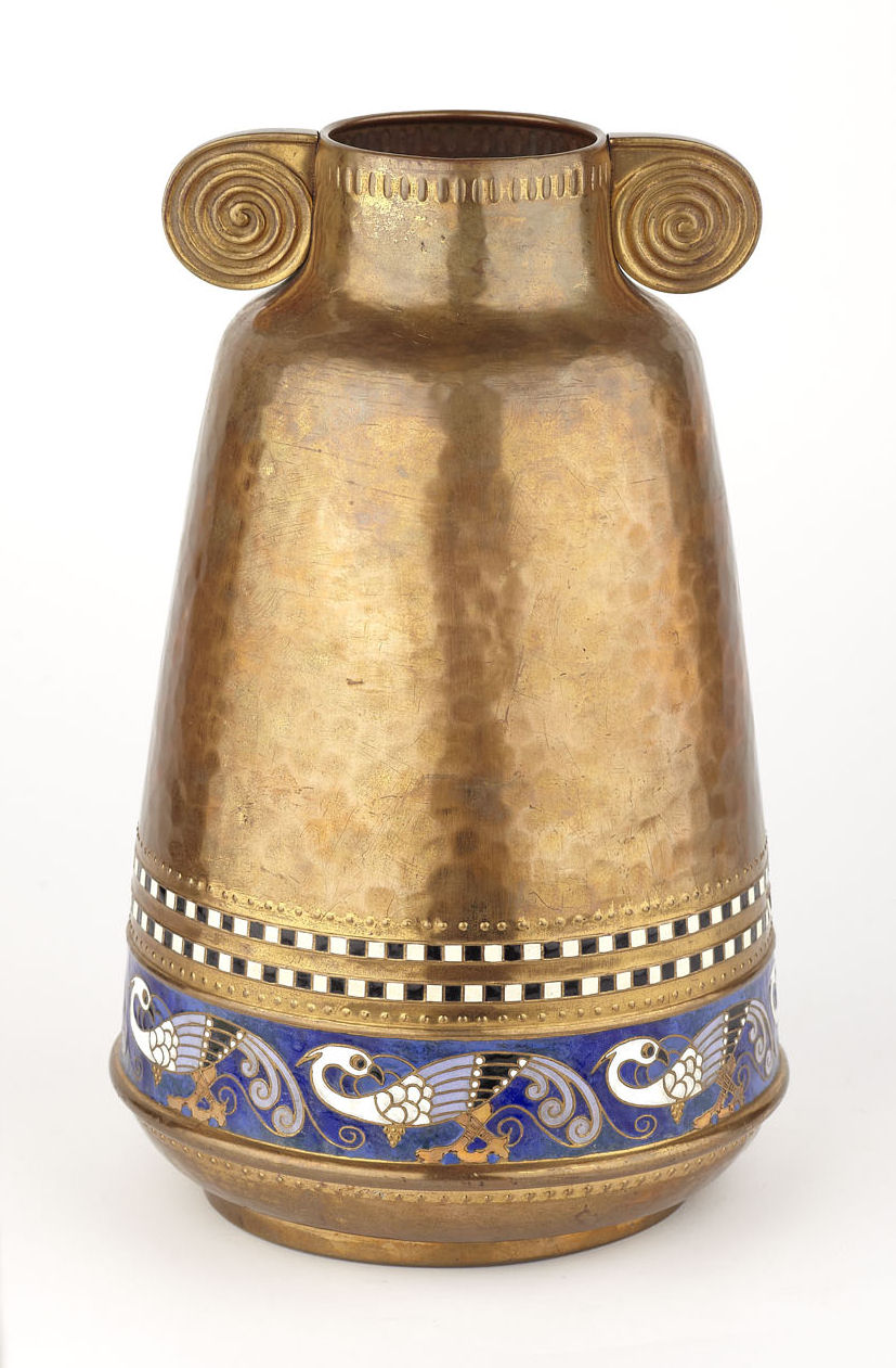 with spirally decorated twin handles, the tapering hammered body with cloisonné enamel frieze of stylised birds and chequer banding, stamped factory marks