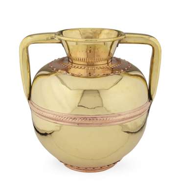 TWIN-HANDLED BRASS AND COPPER URN, CIRCA 1880