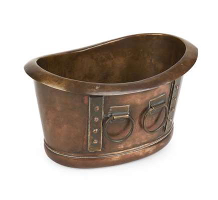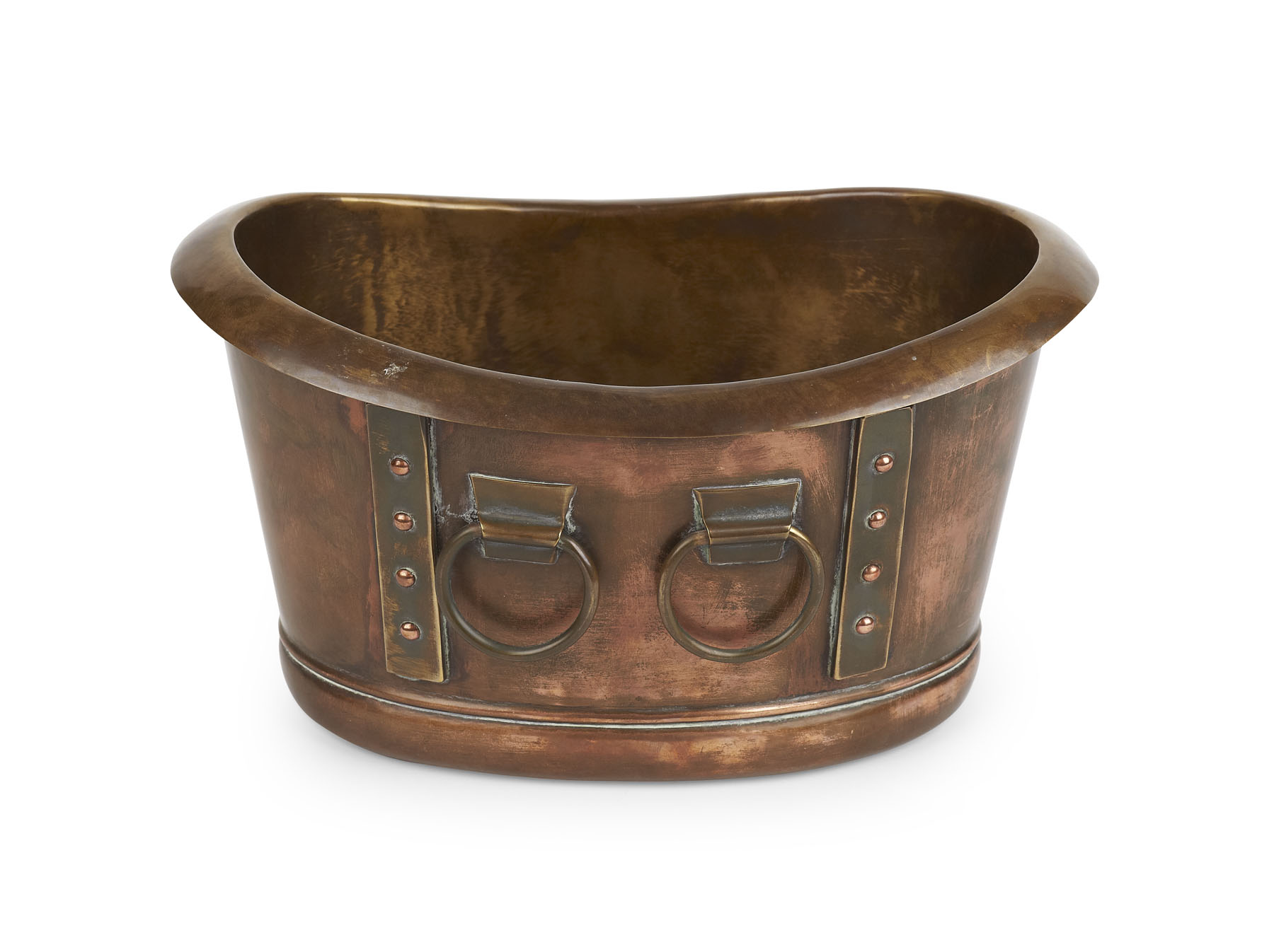 worked as a Roman bath, the liner with rolled rim above an oval section body with riveted straps and ring handles, stamped maker's marks to base