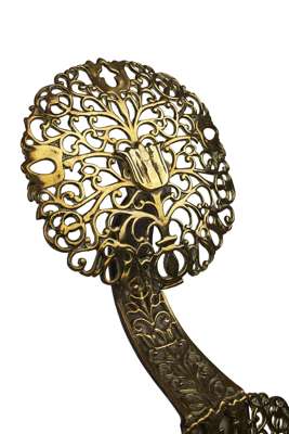 each cast iron frame applied to the front with cut and engraved brass panels and rosettes in floral and foliate designs (2)