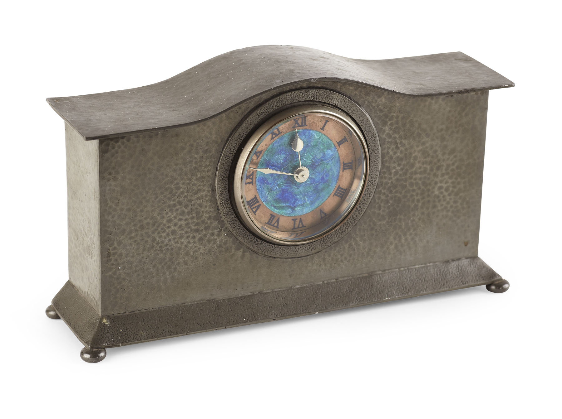 the circular dial with turquoise enamel panel enclosed within rectangular case with hammered finish and serpentine cornice, stamped marks 'Tudric/ 01126A'