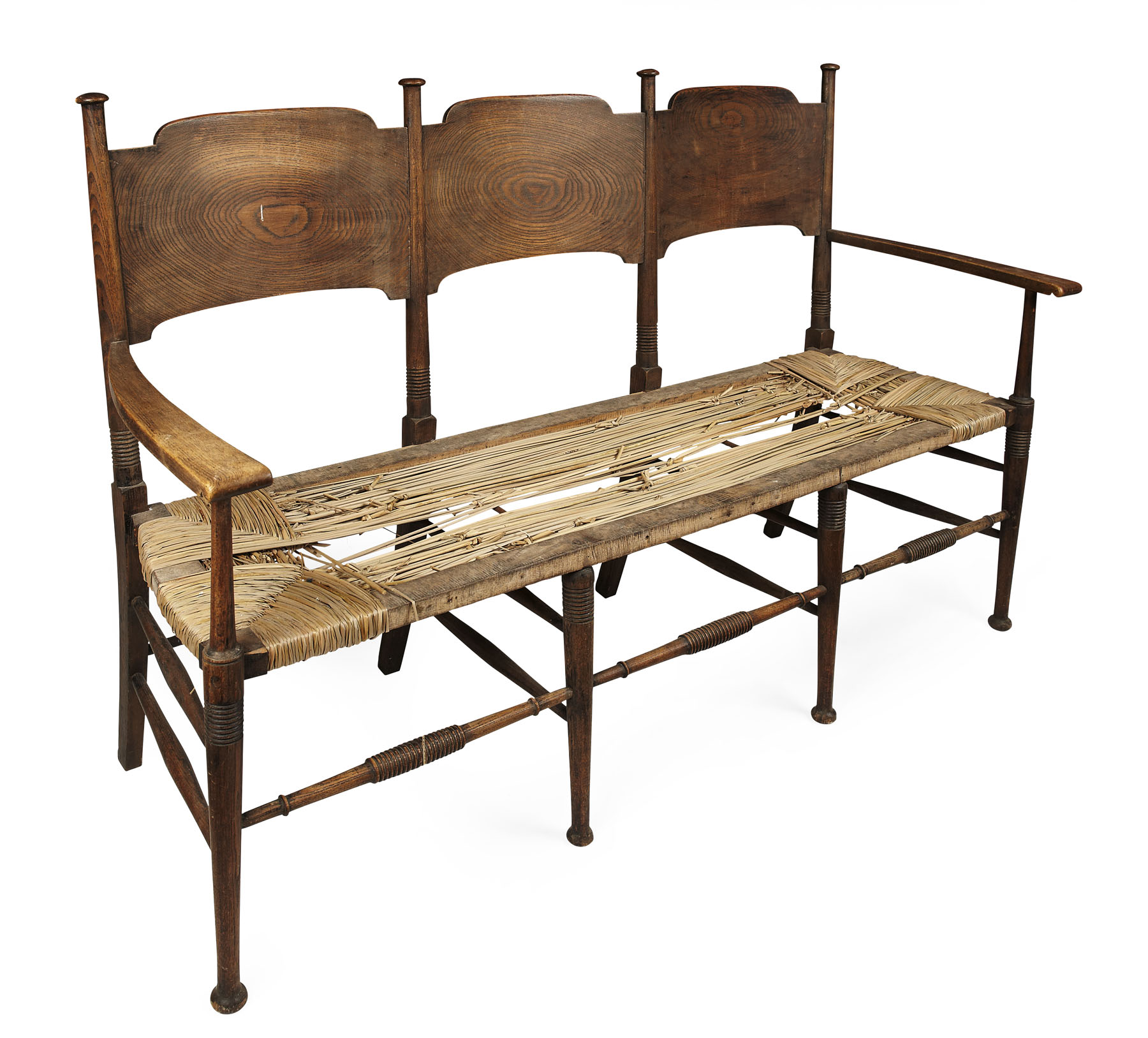 the back with tree curved panels and turned uprights above rush seat (unfinished) on turned tapering legs linked by ring turned stretchers