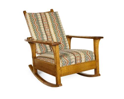 the slatted back with upholstered cushions above stuff-over seat and broad open arms raised on square pegged supports on rocker bases