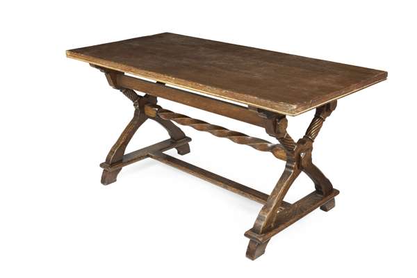 the rectangular top with moulded edge, above cross framed supports, each with spirally reeded elements linked by a spirally fluted central stretcher and with twin planked stretchers above, the platform base raised on bracket feet and linked by a plank stretcher, stamped mark '6848'
