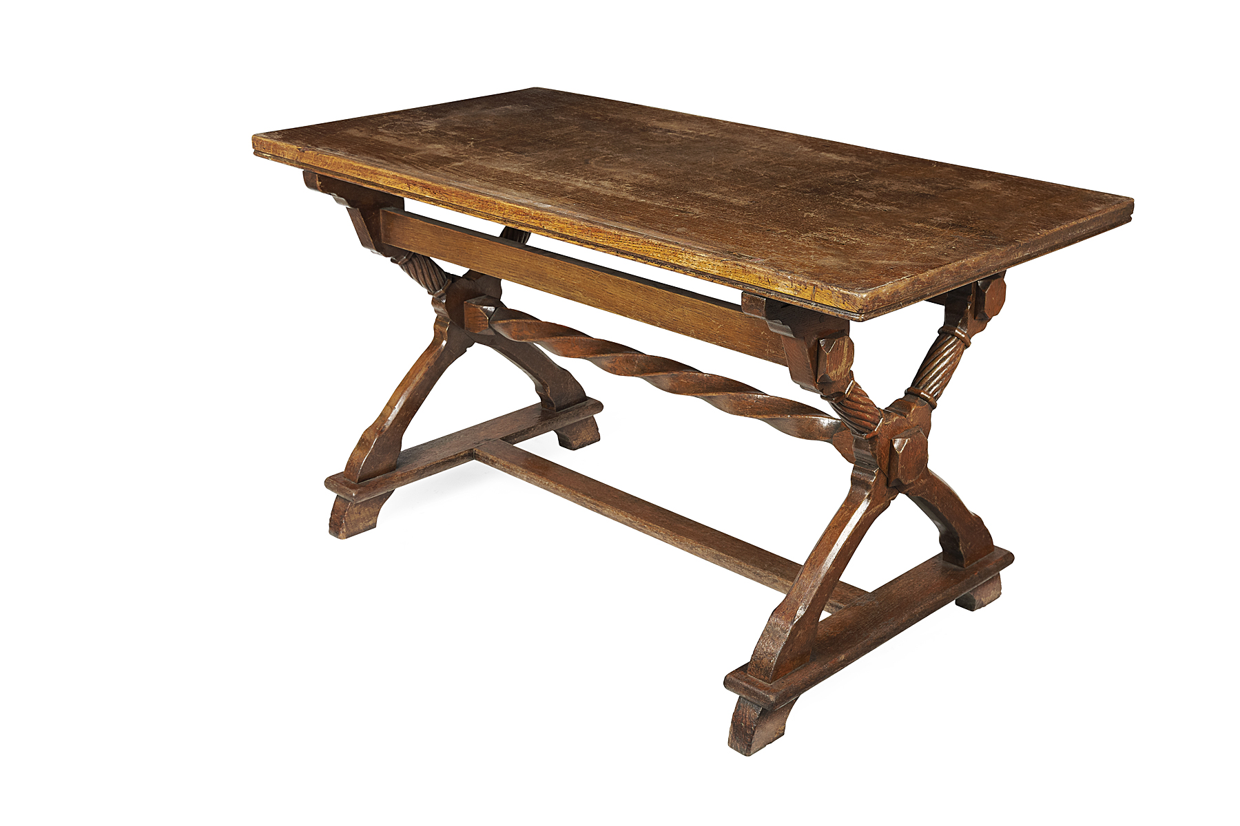 Note: This lot forms part of a collection of Arts & Crafts furniture made in the early 1920s for Liberty & Co's magnificent Tudor building in Great Marlborough Street. The building was completed in 1924 and was built so that trading could continue while renovations were being completed on their adjacent premises in Regent Street. It was designed by Edwin Thomas Hall and his son Edwin Stanley Hall at the height of the 1920s fashion for the Tudor revival and constructed from the timbers of two 19th century men-of-war battleships: HMS Impregnable and HMS Hindustan. After the First World War a more reactionary attitude towards architecture and design was understandable and the Liberty board recognized the marketing advantage and reassurance to their customers of building in the sixteenth century manner. The new building would demonstrate craft of the highest quality and attention to detail and would be a reflection of the Arts & Crafts values of "truth to material" which had played such an important part in the foundation of the company and the goods that it sold.