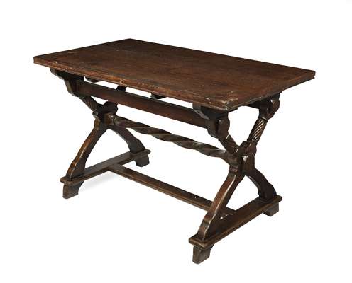 the rectangular top with moulded edge, later inset with brass metre rule, above cross framed supports, each with spirally reeded elements linked by a spirally fluted central stretcher and with twin planked stretchers above, the platform base raised on bracket feet and linked by a plank stretcher, drawer lacking, stamped mark '6964', later label 'Scarves'