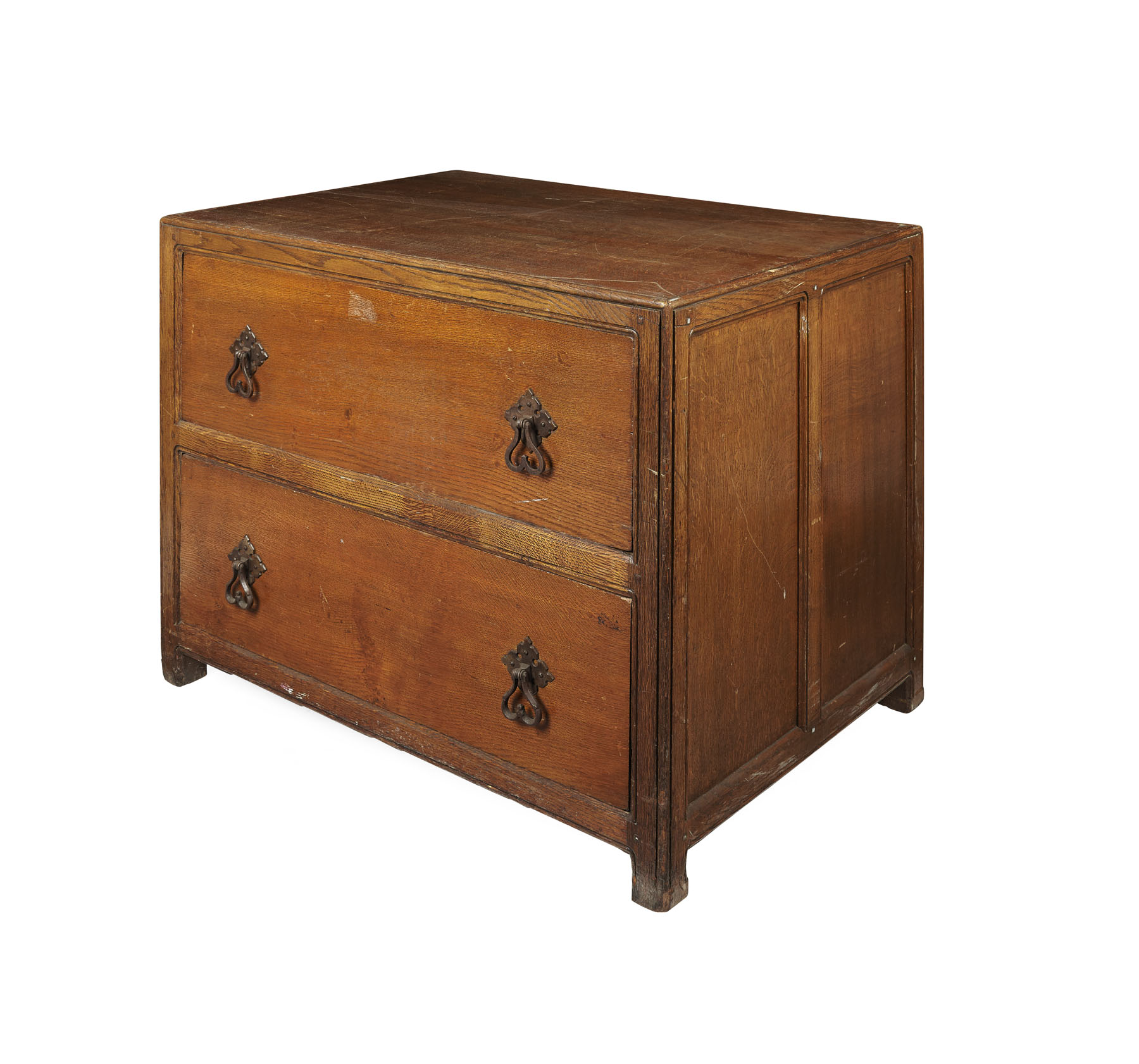 Note: This lot forms part of a collection of Arts & Crafts furniture made in the early 1920s for Liberty & Co's magnificent Tudor building in Great Marlborough Street. The building was completed in 1924 and was built so that trading could continue while renovations were being completed on their adjacent premises in Regent Street. It was designed by Edwin Thomas Hall and his son Edwin Stanley Hall at the height of the 1920s fashion for the Tudor revival and constructed from the timbers of two 19th century men-of-war battleships: HMS Impregnable and HMS Hindustan. After the First World War a more reactionary attitude towards architecture and design was understandable and the Liberty board recognized the marketing advantage and reassurance to their customers of building in the sixteenth century manner. The new building would demonstrate craft of the highest quality and attention to detail and would be a reflection of the Arts & Crafts values of "truth to material" which had played such an important part in the foundation of the company and the goods that it sold.