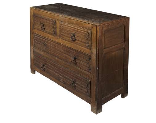 with moulded angles and pegged construction, the rectangular top above two short over two long drawers, each carved with linenfold scrolling decoration and with wrought iron drop handles, the sides and back with fielded panelling, the whole raised on block feet, one handle lacking, one hand a later replacement