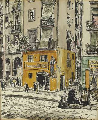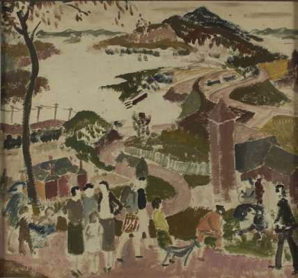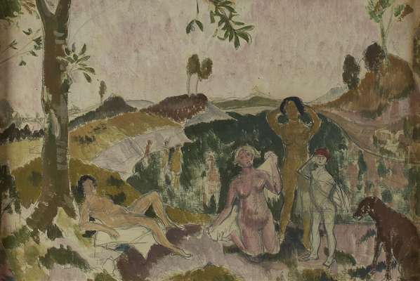 Oil on canvas (unframed), signed 71cm x 91cm; GATHERING BY THE KIRK, oil sketch, unsigned, 46cm x 49cm; ARCADIA, oil sketch, marked in pencil verso 'Wm Drummond Bone 'Arcadia' ex Studio Sale', 26cm x 38cm and a print by Muirhead Bone (4)