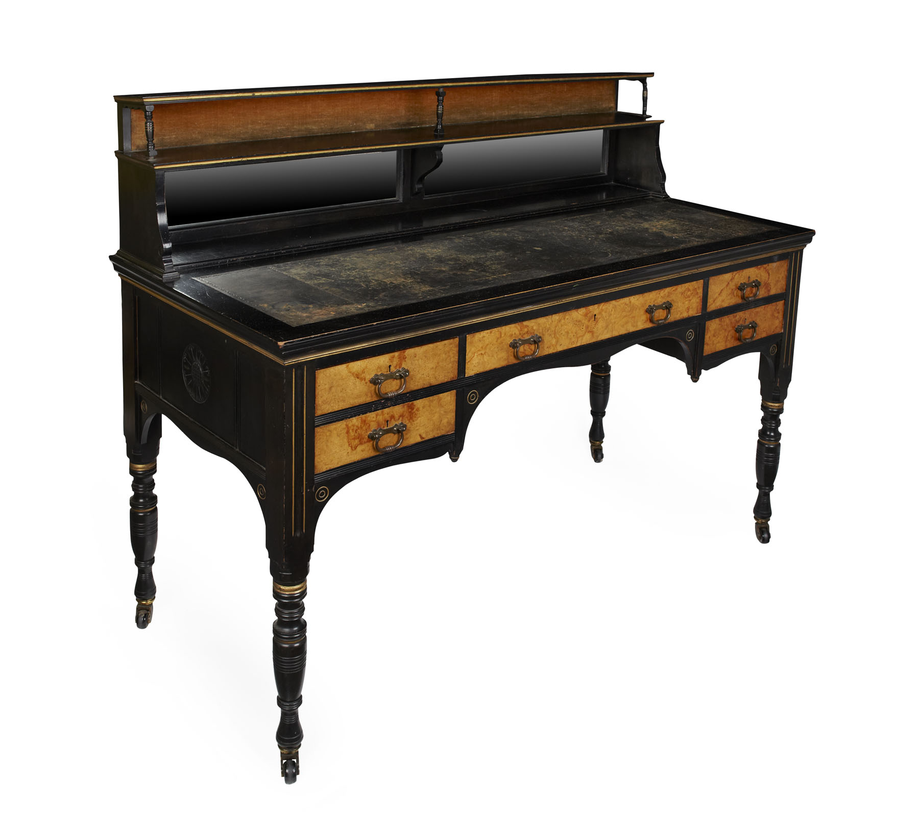 EBONISED AND BURR WALNUT STAGEBACK PEDESTAL DESK, CIRCA 1880