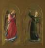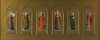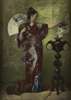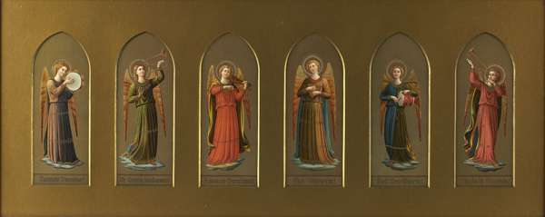 depicting North African and Japanese dancers, each within oak framed with gilt sunflower decoration, 47cm x 39cm; also A SERIES OF PRINTS OF 15TH CENTURY PAINTINGS, within gilt mounts, framed and glazed (5)