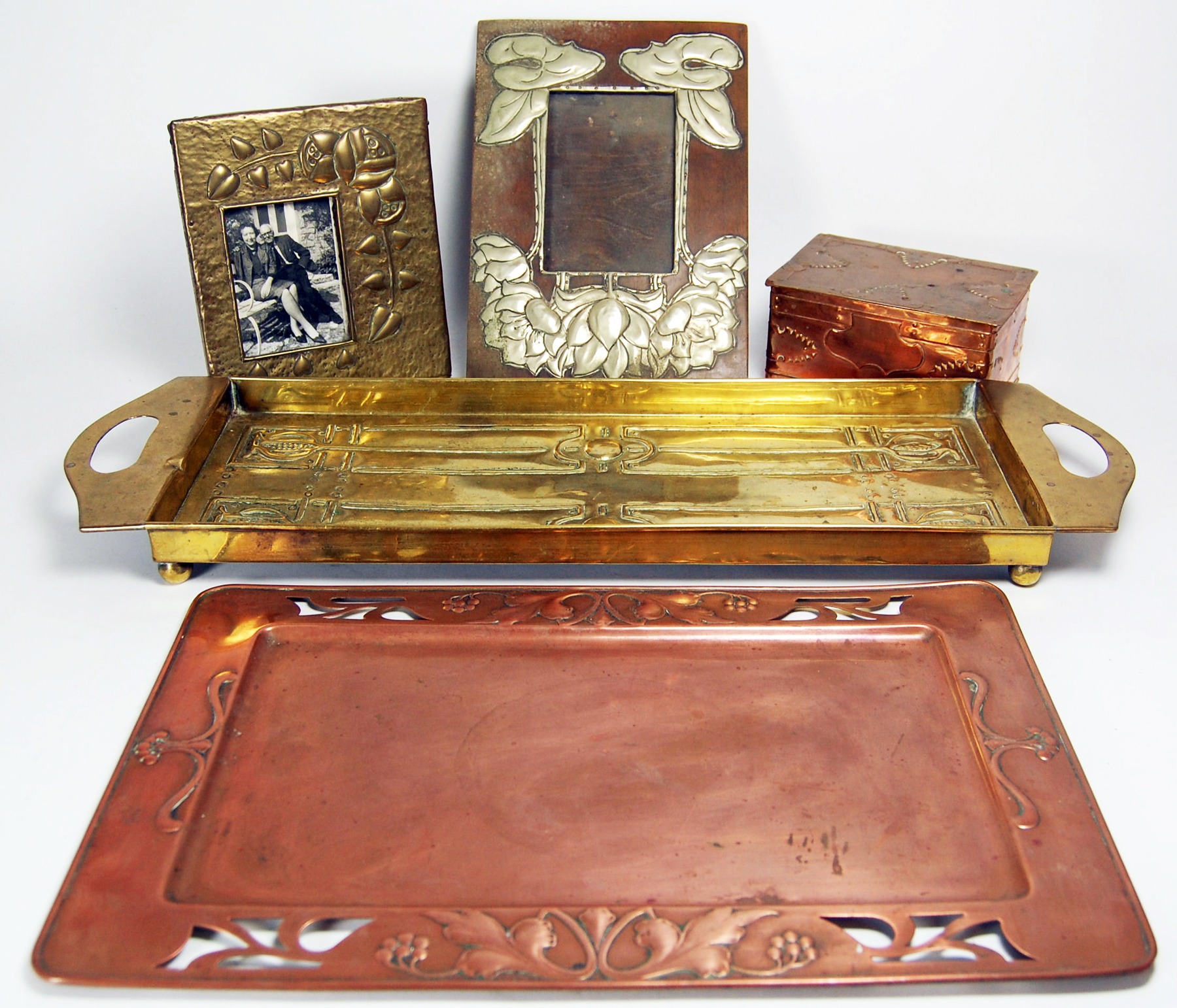 repoussé decorated with stylised seed heads, 65.5cm long; WMF COPPER SERVING TRAY embossed with foliate designs, stamped factory mark, 45cm long; a COPPER CIGARETTE BOX, with serrated strap decoration, 20cm across; a GLASGOW STYLE BRASS PHOTO FRAME, repoussé decorated with roses, 17cm high; and ANOTHER PHOTO FRAME (5)