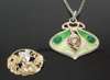 cast as an Art Nouveau maiden in profile, with silvered hair, stamped maker's mark 'A.H.', hallmarked London 1989, 3cm across; and a CONTINENTAL ART NOUVEAU WHITE METAL PENDANT, MODERN, cast as an Art Nouveau maiden within winged surround set with green cabochons and hinged to reveal compartment behind, stamped marks, 4.5cm across (2)