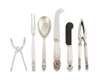 comprising: a pickle fork; a preserve spoon; a pair of sugar nips; a silver and bone butter knife; and a pair of silver and stainless steel nutcrackers, each with marks for 1933-1977, 2.7oz weighable silver (6)