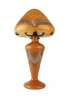the domed 'mushroom' shade raised on a shouldered tapering base with spreading foot, the pale orange mottled glass with pulled 'silver' banding, bears paper maker's label 'V.P/3.200'