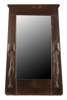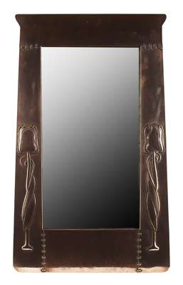 the rectangular plate within a surround with tapering uprights, repoussé decorated with stylised tulips, and with rivet decoration, the reverse with ivorine label 'Liberty, London'