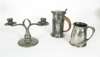including a LIDDED WATER FLAGON, cast with heart motifs, stamped marks, 0279, 17.5cm high; a TANKARD, with beated finish, stamped marks 066, 11cm; and a TWIN BRANCH TABLE CANDELABRA, also with beaten finish, stamped marks, 01748, 23.5cm across (3)