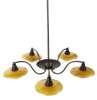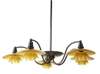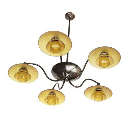 amber coloured glass and patinated metal, each light with three graduated shades, each hung from five curved branches with central convex dish and column support, stamped marks to the underside of each socket, 'P.H. - 1 Patented'