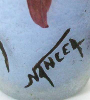decorated with birch trees in a landscape, enamelled mark to base 'Daum/ Nancy' with Cross of Lorraine symbol, 5.7cm high; and a NANCEA ETCHED AND ENAMELLED VASE, decorated with fruiting brambles, enamelled mark 'Nancea', 4.7cm high (2)