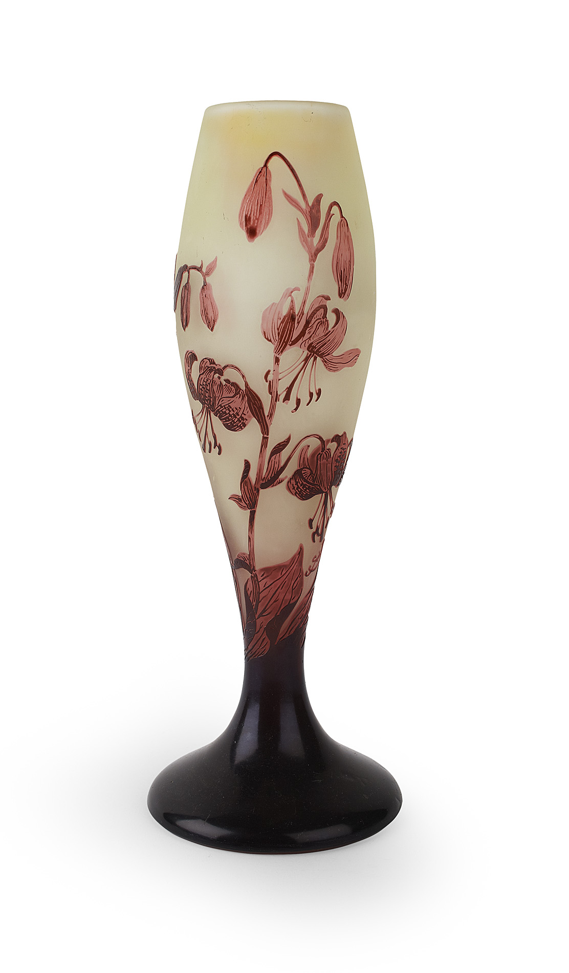 of baluster form with spreading foot, overlaid in ruby red glass and acid-etched with tiger lilies, cameo signature 'Gallé'