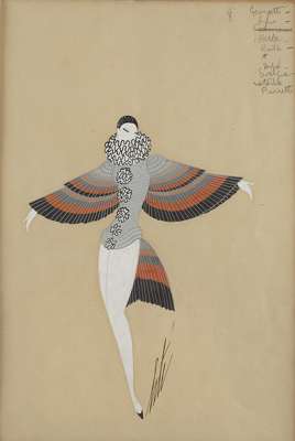 gouache, signed in ink, bears pencil inscription'8/ Georgette/ ***/ Herta/ Ruth/ Delia/ Evelyne/ Natacha/ Pierrette' and inscribed verso 'A Anne McConnell/ en bon souvenir/ Erté/ Paris 22-2-75'