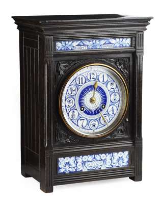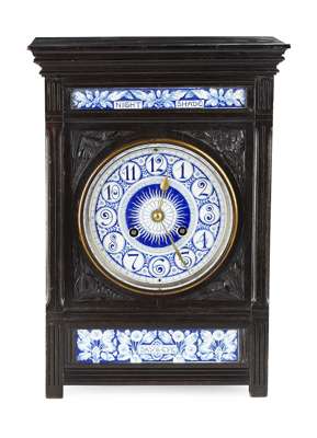 the twin train French movement, with circular ceramic dial, painted in blue on white with stylised Arabic numerals, within flower carved case inset with corresponding ceramic panels painted with daisies and nightshade and inscribed 'Night's Shade' and 'Day's Eye'