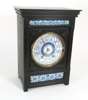 the twin train French movement, with circular ceramic dial, painted in blue on white with stylised Arabic numerals, within flower carved case inset with corresponding ceramic panels painted with flowers and foliage