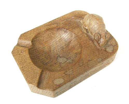 the canted rectangular frame enclosing a brass framed barometer, thermometer and hygrometer, carved mouse signature, 43cm high; and a ROBERT (MOUSEMAN) THOMPSON OAK ASHTRAY, of canted rectangular form, 10cm across (2)