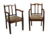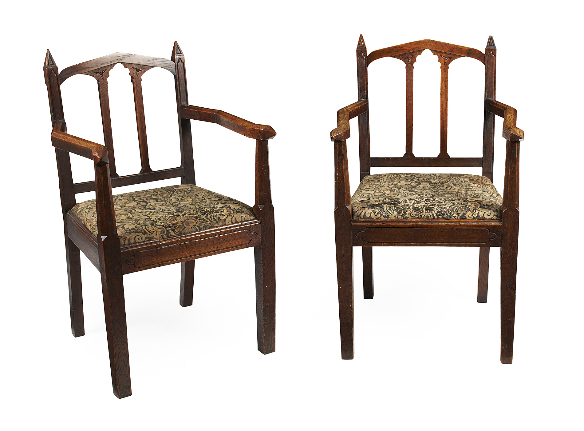 each with arcaded backs and angular open arms above drop-in seats and square panelled legs united by stretchers (2)