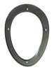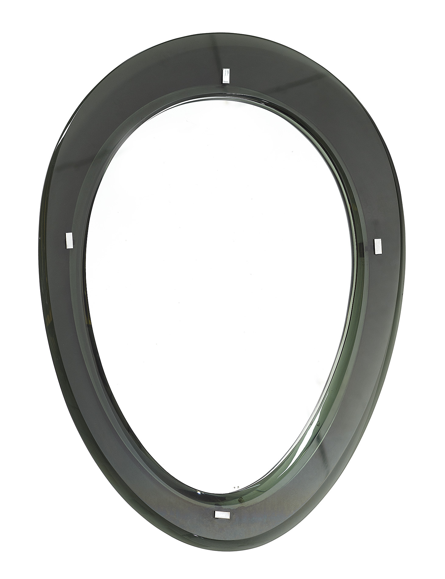 the elliptical organic form, the mirrored plate enclosed by a grey and green frame