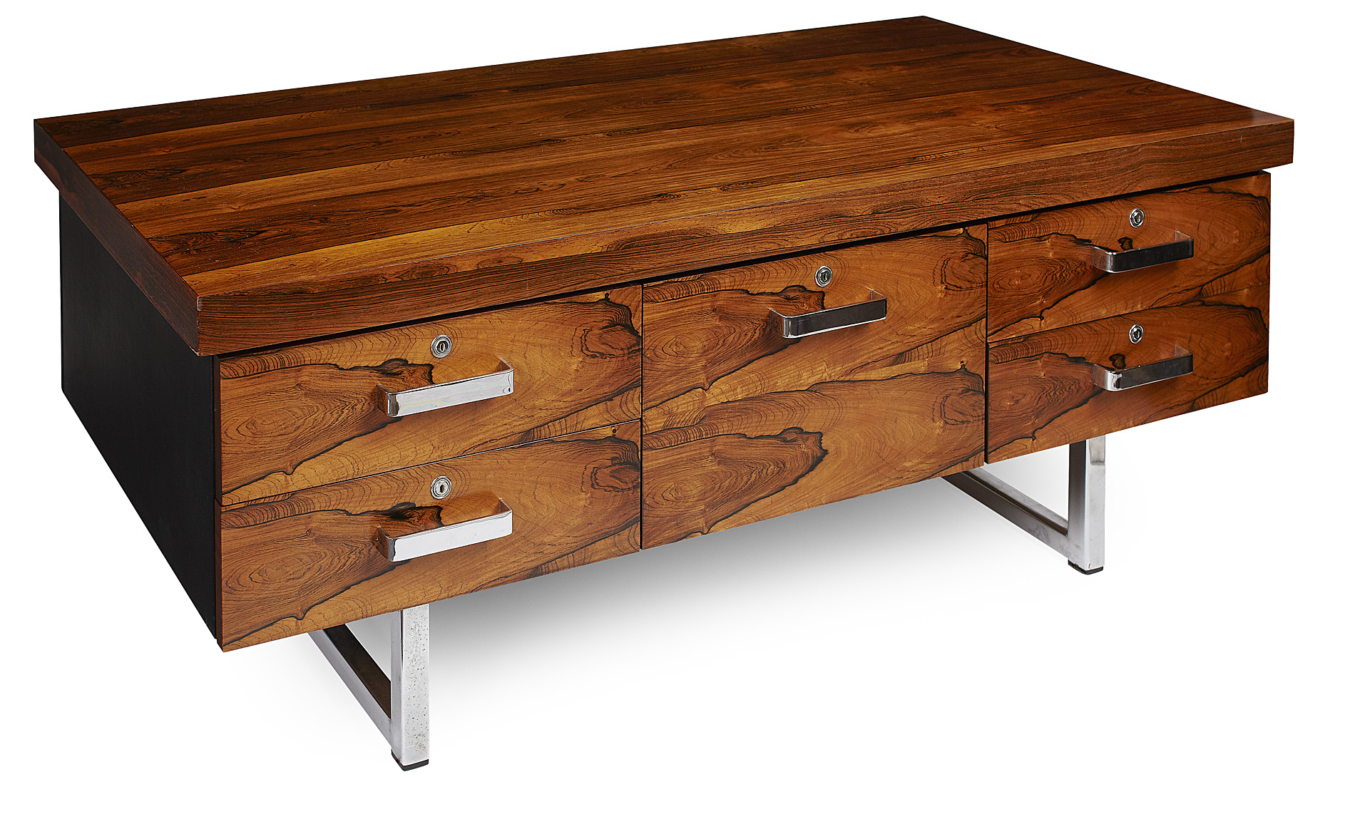 rosewood framed, with an arrangement of five drawers raised on a chromium plated steel base, the back and sides coved in vinyl upholstery