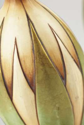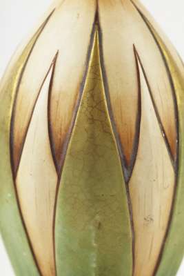 each of slender footed baluster form, moulded with leaf motifs and painted in gilt and colours, impressed marks, '1152/ 51' (2)