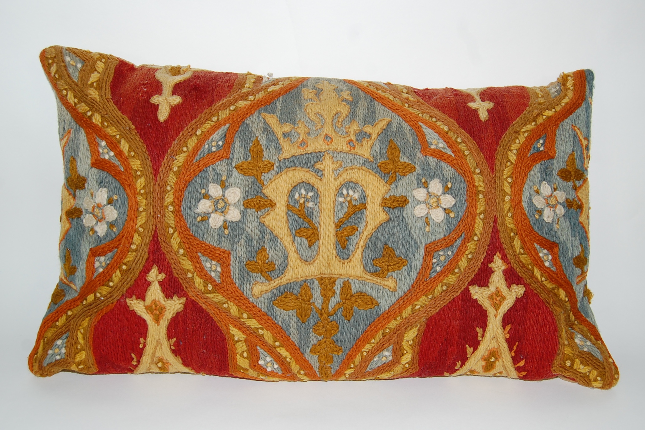 worked in coloured wools with strapwork panels of leaves and flowers, centred by the letter M and a coronet